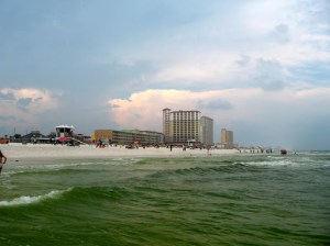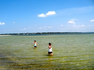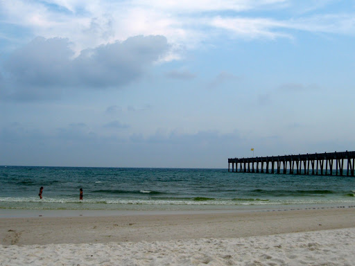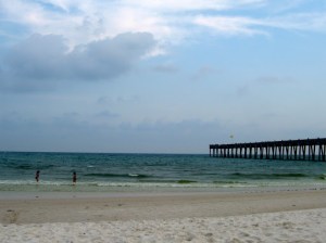 We checked in, and then went straight back to the car, beach bag in hand, and drove the 20 minutes through Pensacola, and Gulf Breeze (Gulf Breeze, for the love of pete!) to Pensacola Beach. It must have been around 5:30 by the time we parked and got into our bathing suits. The sand in this area apparently is the whitest in the world, caused by quartz being ground in the rip tides and currents. While I was trying to find confirmation of this last statement (I get a little fuzzy about the details) I found this article about the oil spill a couple of weeks before we arrived at the exact beach. Needless to say, when we went swimming in these waters, there was no sign of the oil spill. The clean up crews must have done an amazing job.