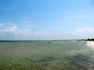 We finally stopped outside of Fort Walton Beach . Okay, “stopped” doesn’t quite describe the split second when I pointed to a patch that looked like a parking lot on the other side of the highway and Jeremy screeched on the brakes, then turned into oncoming traffic to come to a full stop in an unmarked lot looking onto a long narrow beach with hardly anyone on it.