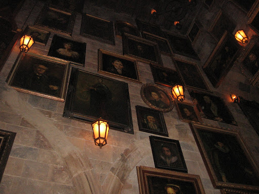 To get to the Forbidden Journey, one of the 3 rides in Harry Potter world, you go through the castle. The line winds its way through the greenhouses, where pitcher plants are hanging from the ceiling, and mandrakes are in locked cages. J was amazed at the incredibly well done scenic paint job in this place, where they made the greenhouse look rusty. Then into the castle, where you go past the entrance to Dumbledore’s office,