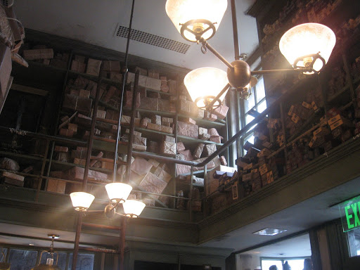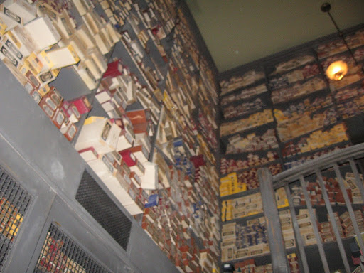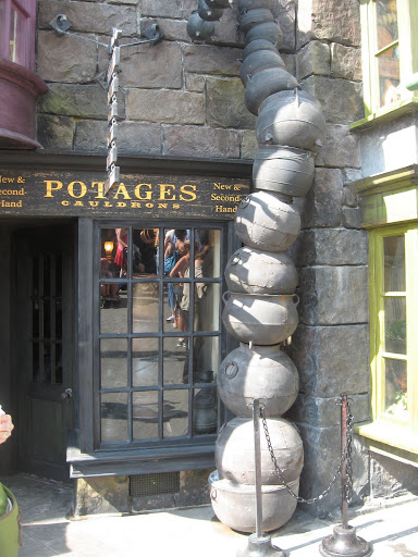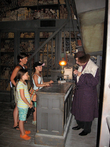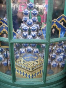 The lights dimmed and once everybody was in the “show” began. Mr. Ollivander chose a boy from the group and began the whole wand choosing spiel. After he determined what his wand arm was, what his birthday was, etc. Thus began the process of trying out the wand. The boy gave one a swirl and tried out one. The sound of thunder roared through the room and Mr. Ollivander hastily chanted a spell to make it stop. Finally he gave the kid another wand, saying the classic, “I wonder…” and of course, a spotlight shines on the boy, there is a breeze and a chorus that I guess is supposed to sound like destiny and voilà! The wand chooses the boy. Then we are shunted from the shop into the extremely crowded giftshop. That’s it.