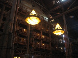 And the attention to detail was astounding. The wilderness Lodge obviously had an old west theme – all the furniture looked like it had been carved out of logs in our rooms. The elevator was wood panelled and inlaid with little animal designs in it. This was to be our first glimpse into that famous magic of Disney, the ode to the craft of scenic painting and props.