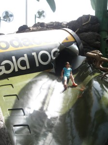 The we headed to the Studio Backlot tour. After a wait of about half an hour, we were herded in with a group and 3 people from the audience were taken as volunteers. We then walked to a viewing platform looking onto a tank with a boat on it as well as a cross-section. The volunteers came out in rain gear and they proceeded to show us how many of the water scenes are made in movies. Think sinking of the Titanic in James Cameron’s film. The scene included the boat being attacked with an aerial bombing so there were many explosions. Very cool. Then we got to hop on one of those tourist trolleys around the backlot where we got to see many of the props used in various movies, as well as this scene below, which showed us how: