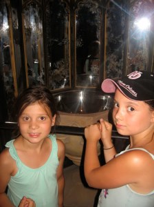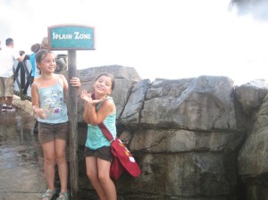 After our Forbidden Journey odyssey and a couple more times on the Flight of the Hippogriff (that was starting to rearrange my spine), we decided to walk around the rest of the park until night time, so we could see Harry Potter in all its fake gaslit beauty. The first stop of course, was the Splash zone. No, the photo is not washed out – all that white is the water about to land on my daughters.