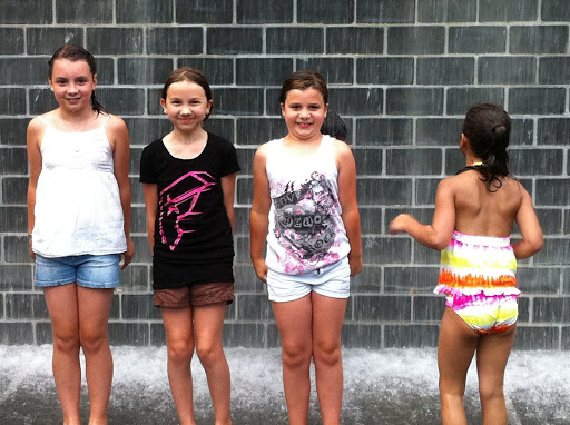 Okay. This thing deserves a little paragraph. There are two of these structures made out of glass blocks that project different faces on them. When we were in Chicago in March, they looked a little forlorn in their empty square of concrete. However, little did we know then that in the summer these large glass faces spew water from their mouths and it is the weirdest, largest art/water park we have ever seen.